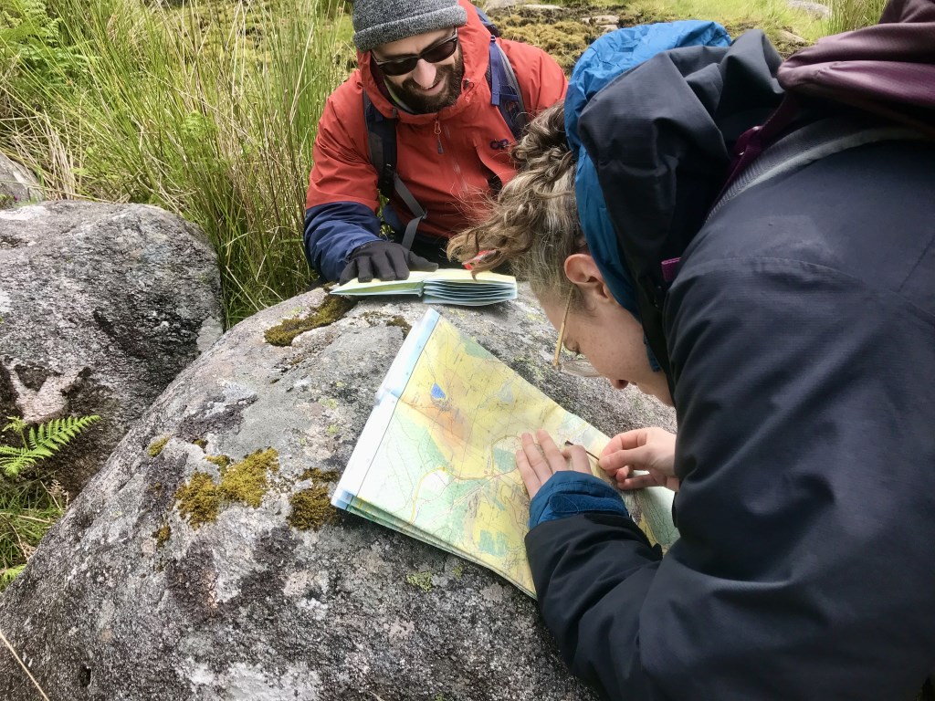 Mountain Skills 1 Navigation course. 6 clients out on MS1. Great discussions even before we left the car park as someone forgot their boots. what if you went with the sandals, had a slip, required rescue. Volunteers come up to help, they would help but probably quietly thinking why are you not wearing boots! Why did the course provider let you out without boots...We found some boots that fitted and all was good. Before booking one client had mentioned he was in remission from cancer so we had a chat about that and what to expect. My attitude is it's about learning to navigate not hike long distances so we had short legs plenty of stops and well spaced steer ground. lots of deer and wildlife about on Sunday. We did a loop of. the lead mines and everyone was very pleased to see the history, and to be able to navigate from mine entrance to mine entrance. Saturday was windy so we stayed to the side only getting to cols and summits when required. Sunday was not so bad, but almost chilly. My spare jacket was used by one client.