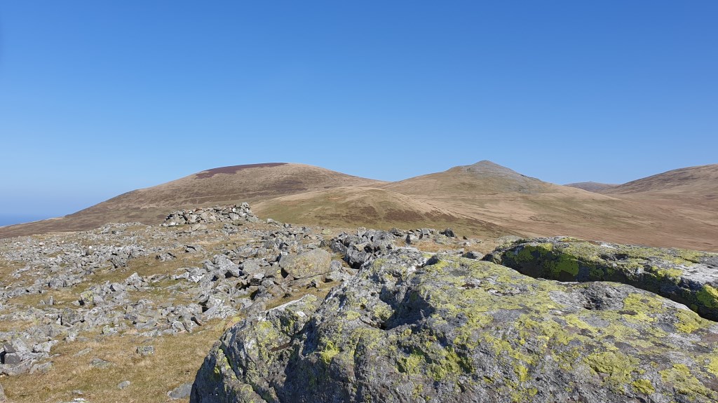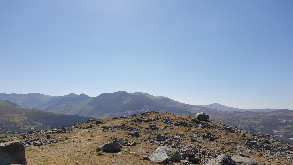 The Carneddau (lit. "the cairns"; Carneddau is a Welsh plural form, and is sometimes anglicised to Carnedds) are a group of mountains in Snowdonia, Wales. They include the largest contiguous areas of high ground (over 2,500 or 3,000 feet (910 m) high) in Wales and England, as well as six or seven of the highest peaks in the country—the Fourteen Peaks. The range also encloses a number of lakes such as Llyn Cowlyd and Llyn Eigiau, and the Aber Falls waterfalls. It is delimited by the Irish Sea to the north, the Conwy valley to the east, and by the A5 road from Betws-y-Coed to Bethesda to the south and west. The area covers nearly 200 square kilometres, about 10% of the area of Snowdonia.
